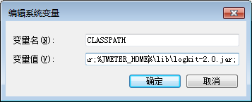 - 编辑 CLASSPATH 变量,加上 %JMETER_HOME%\lib\ext\ApacheJMeter_core.jar;%JMETER_HOME%\lib\jorphan.jar;%JMETER_HOME%\lib\logkit-2.0.jar;