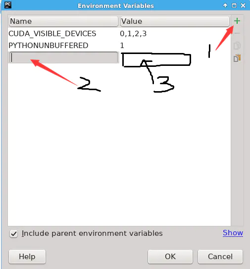 点击下图中1处的’+’,会出现2处,增加CUDA_VISIBLE_DEVICES,再点击3处,填入0,1,2,3。(下图中第一行已经增加了,只不过为了说明,因而这样表示)