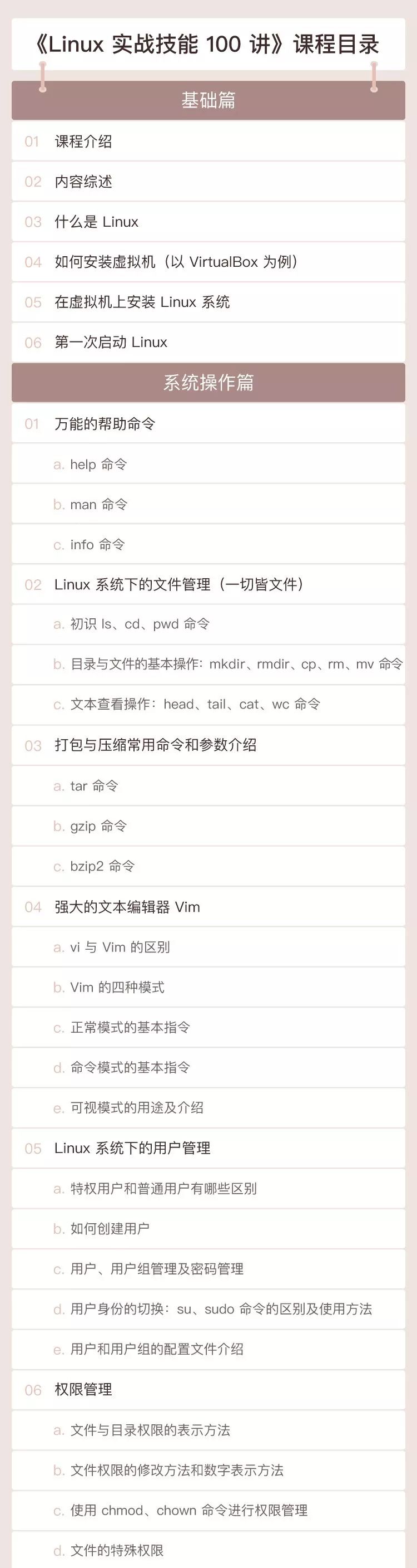 在《Linux 实战技能 100 讲》视频课中,我将带你掌握 Linux 的常用命令、Vim、sed、awk 文本管理、Shell 编程以及 LNMP、FTP、SSH 等常用服务的搭建,这些已足够你应对工作中 85% 以上的 Linux 使用场景,同时也为你今后更深入地学习 Linux 高级功能打下坚实基础。