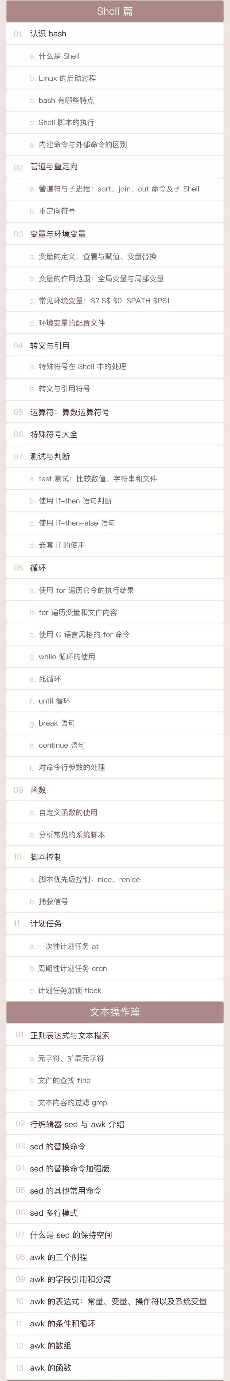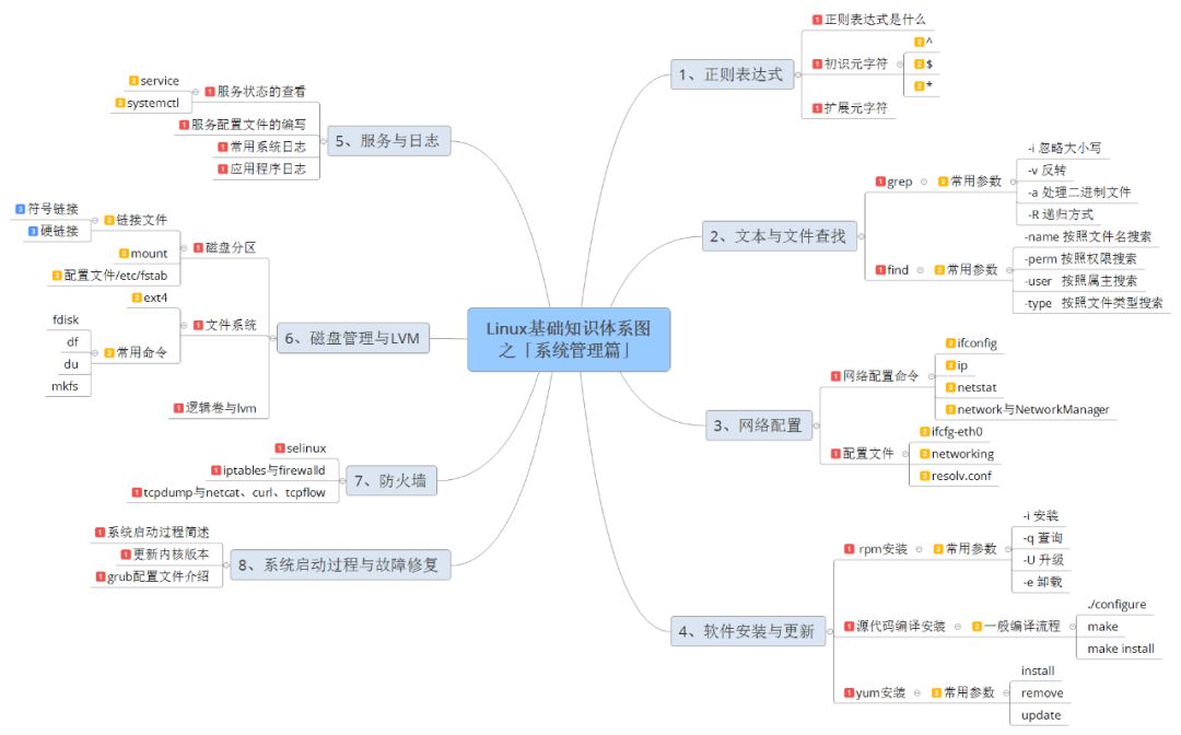 为了方便大家学习,我把课程的知识总结了一份脑图,内容包括:基础篇、系统操作篇、系统管理篇、Shell 篇、文本操作篇和服务管理篇。以下是高清版「Linux 基础知识体系图」。