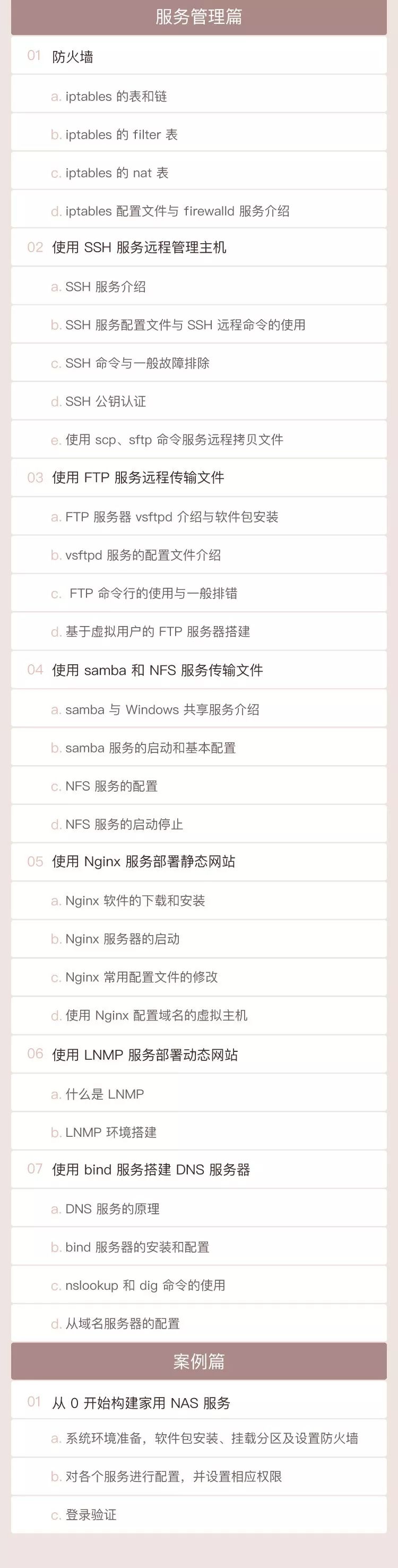 最后,我们根据前面学到的知识,就可以开始搭建常用的服务了,比如 SSH、FTP、DNS、LNMP 等等。我还设计了一个有趣的动手环节,手把手教你搭建一个家用多媒体共享服务(NAS),你可以通过它远程下载你喜欢的电影,同时它还支持家庭成员之间的资料备份、文件共享等功能,未来你甚至可以把它打造成一个家庭娱乐中心。