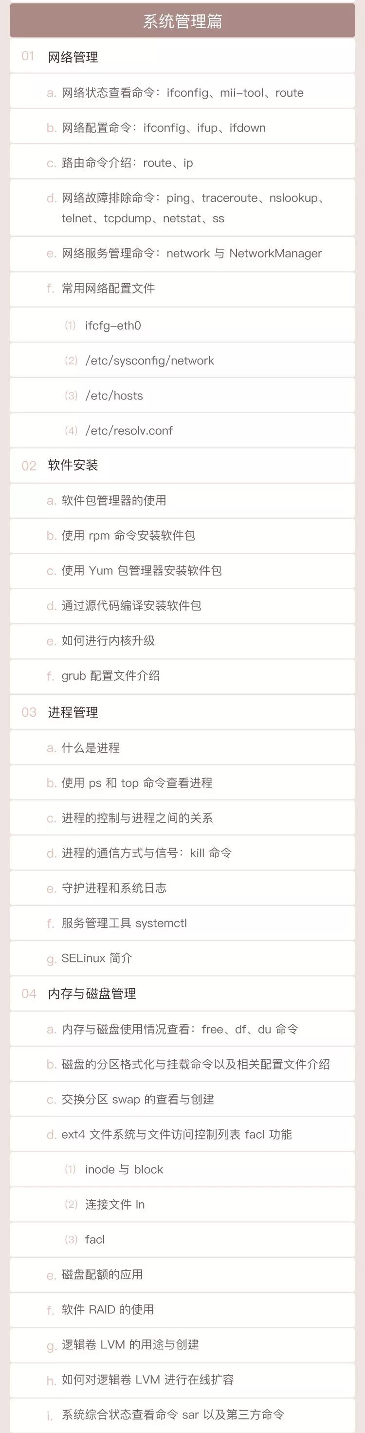 其次,在系统管理篇,我会带你剖析网络管理、进程管理、文件系统以及内存与磁盘管理的原理,这是你从 Linux 使用者成长为系统管理员的必经之路,这部分内容也能让你“更有深度”。哪怕你没有系统编程经验,也可以理解命令后面的工作原理,在今后遇到系统故障也能很快地找到解决办法。