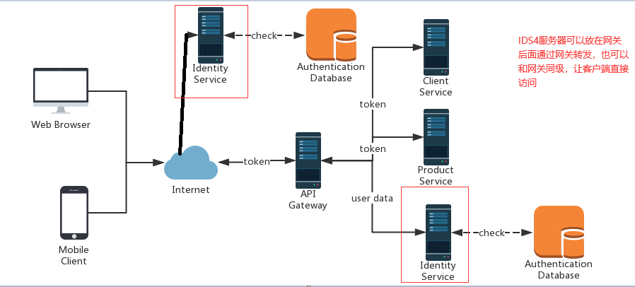 我们前面尝试了在业务服务器上加IDS4校验,实际上是不合理的, 在生产环境中,业务服务器会有很多个,如果把校验加在每个业务服务器上,代码冗余且不易维护(很多情况下业务服务器不直接对外开放),所以我们通常把校验加在Ocelot网关上,也就是说校验通过了,Ocelot网关才会把请求转发给相应的业务服务器上.(我们这里通常是网关和业务服务器在一个内网中,业务服务器不开放外网)