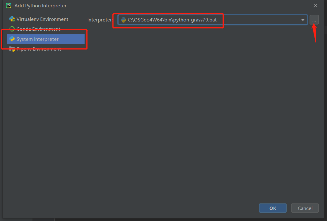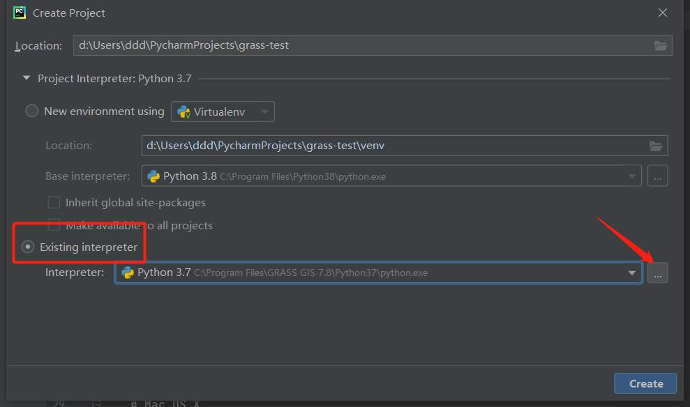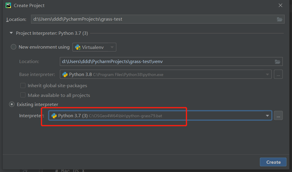 2. 然后设置Python解释器为python-grass79.bat文件,创建工程