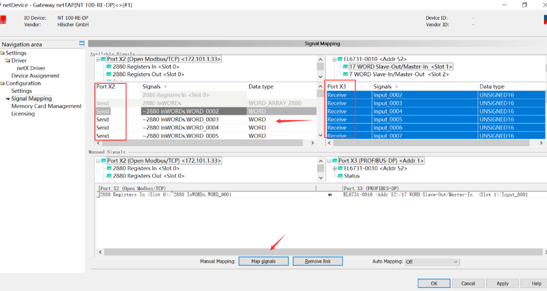 (11)再次双击网关(或右击网关,选择“Configuration”“Gateway”),弹出对话框,选择“SignalMapping”项,进行数据映射,点击下方“Map Signal”,完成所有数据映射后点击Apply按钮,如图。