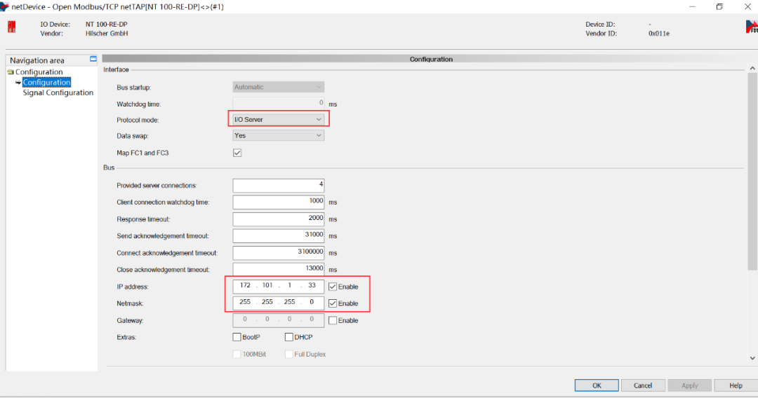 a.在SYCON软件中,选择“Configuration”“Open Modbus/TCP”,弹出对话框,设置Open Modbus/TCP的Protocol mode及IP地址等参数,这里设置为IOServer,如图: