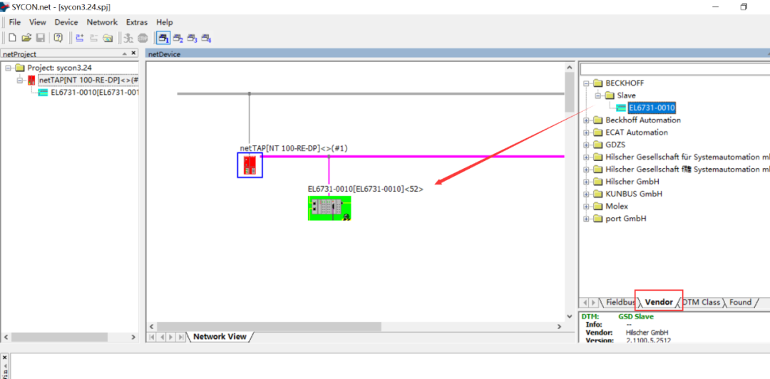 (7)从右侧Fieldbus选项中“Vendor”对应厂商下找到导入的eds文件,拖到中间窗口与网关相连的紫色线下,如图: