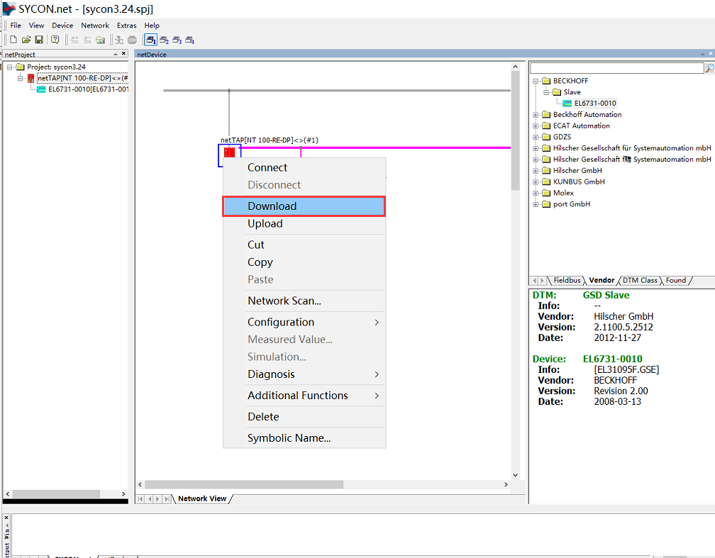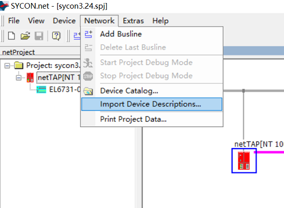 (6)选择菜单栏“Network”下“Import Device Descriptions”选择第三方PROFIBUS DP设备的从站eds文件导入SYCON配置软件中,以便进行PROFIBUS DP网络组态与配置。如图: