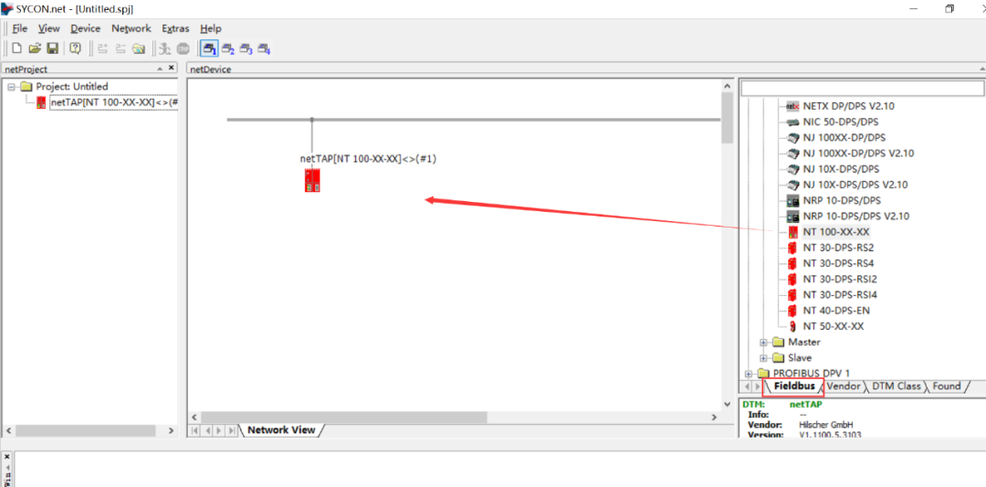 (2)在软件界面右侧选择“Fieldbus”栏,将PROFIBUS DPV 0,Gateway / Stand-Alone Slave 文件夹中的NT 100-XX-XX 图标(代表网关)拖放至中间区域的灰线下方,如图所示: