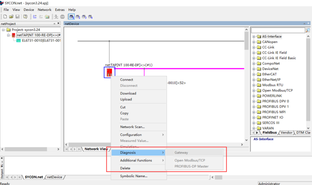 (1)网关支持在线诊断,选择网关,保持USB线缆与计算机相连,右键先“Connect”,后选择“Diagnosis”可分别查看网关、PROFIBUS DP端与Open Modbus/TCP端通讯状态。如图: