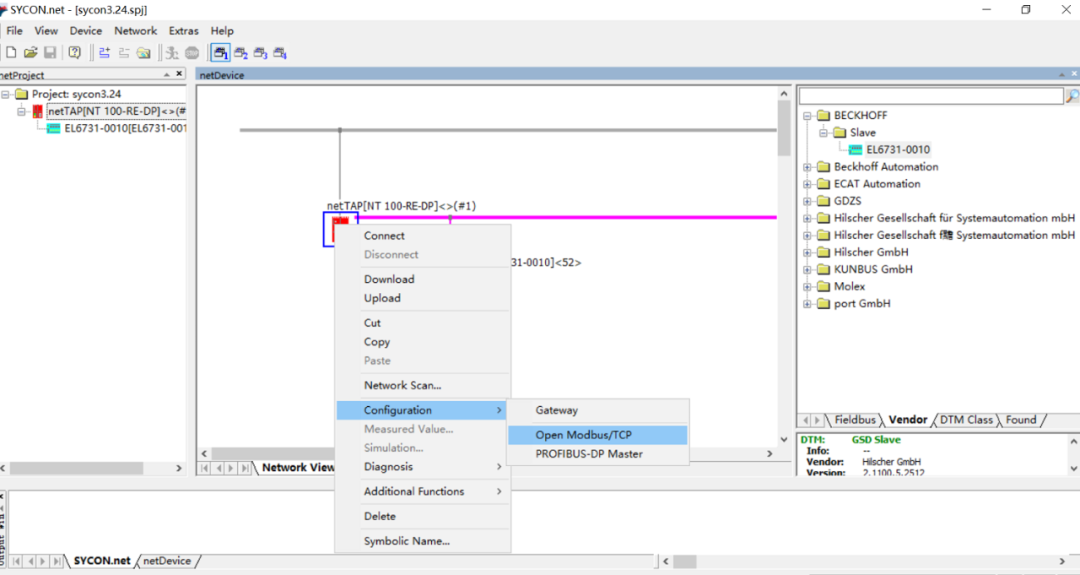(8)右击网关图标,选择“Configuration”可分别对网关、PROFIBUSDP端与Open Modbus/TCP端进行配置。