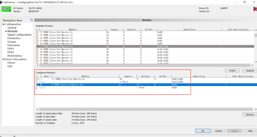 b.双击紫色线下连接的PROFIBUS DP从站,在弹出的对话框中设置从站的输入输出数据量。从“Avalible Modbules”选择需要的数据模块,点击“Insert”后可在“Configured Modules”中看到配置参数,这里以一个17 WORD个输入,7 WORD个输出,如图: