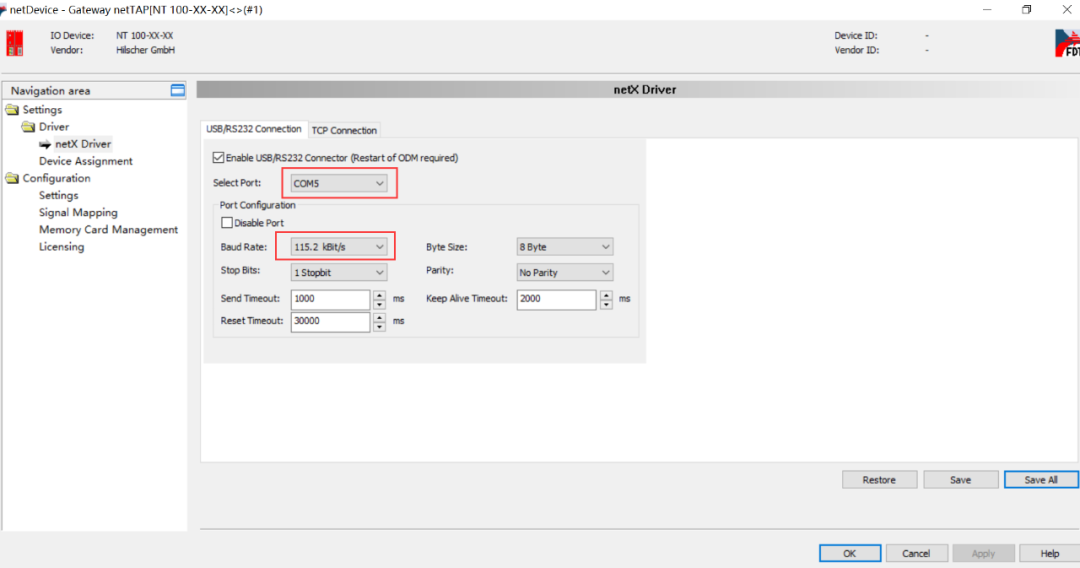 (3)双击该图标,弹出配置对话框,选择“netX Driver”栏中“USB/RS232Connection”页,确保“Enable