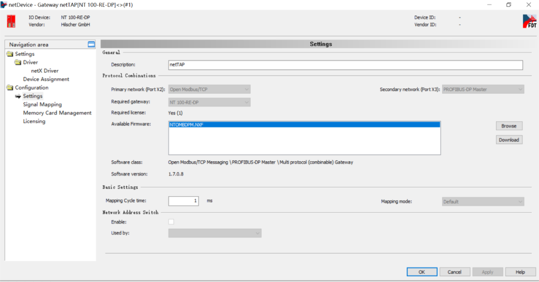 (5)选择“Settings”栏,Port X2 选择 OpenModbus/TCP协议,Port X3 选择PROFIBUS DPMaster协议,如图所示。选中对应的 Available Firmware,单击右侧的 Download 按钮,下载对应的固件。固件下载完成后,单击 OK 按钮退出该对话框。