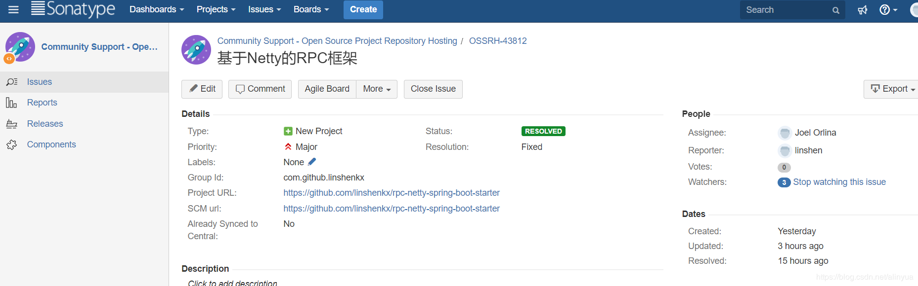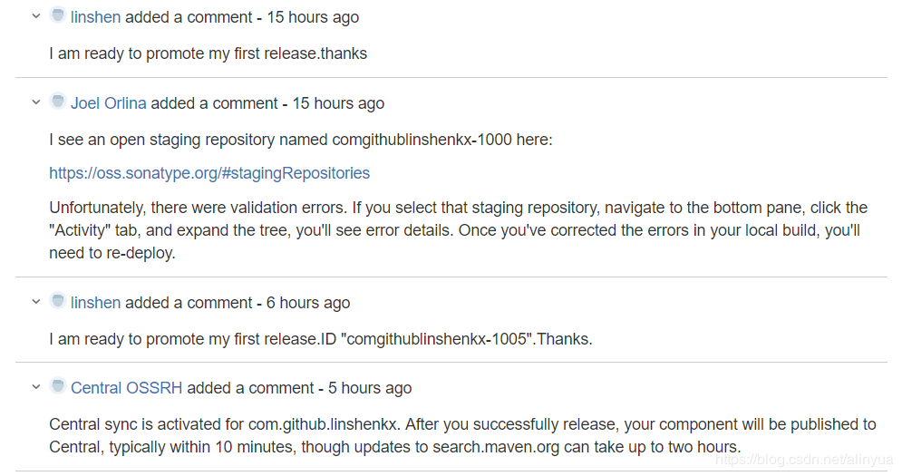 上述步骤顺利完成后到issue下评论,如下,第一次在close的时候就已经失败了,我没有注意到就去comment,后台管理员提醒我去查看错误信息,第二次comment后就顺利通过。大概过两个小时就可以去 search.maven.org 检索上传的jar包了。
