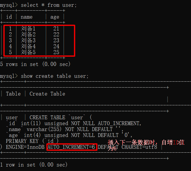 向user表里插入5条数据,主键ID按自增列通过auto-increment计数器实现自增。