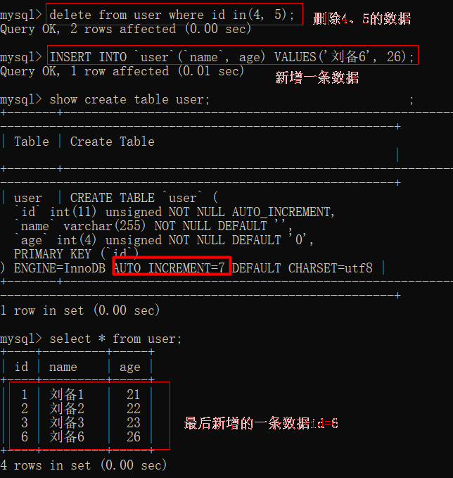 在user表里删除id为4、5的数据,再向user表中插入一条数据,主键ID是auto-increment的值6。