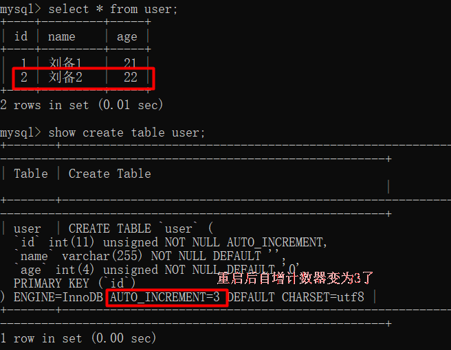 然后重启数据库后,auto-increment计数器的值变为3,也就是user表里的自增列ID的最大值2加1。