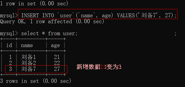 INSERT INTO `user`(`name`, age) VALUES('刘备3', 23);