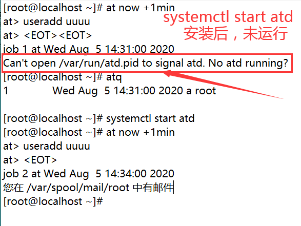 ps :有的时候,输入at回车发现不能成功运行。这时候就需要使用 systemctl start atd 这个命令刷新一下,就能成功运行了~~
