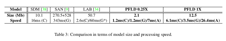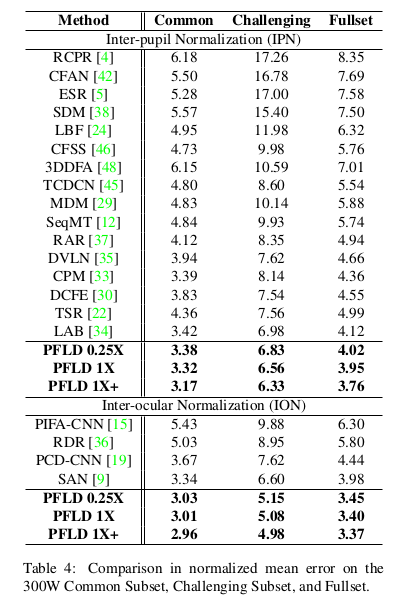 其中PFLD 1X是标准网络,PFLD 0.25X是MobileNet blocks width 参数设为0.25的压缩网络,PFLD 1X+是在WFLW数据集上预训练的网络。