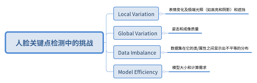 在现实世界条件下,获得完美的面孔几乎是不可能的。换句话说,人脸经常是出现在控制不足甚至没有约束的环境中。在不同的照明条件下,它的外表有各种各样的姿势、表情和形状,有时还有部分遮挡。图1提供了这样的几个例子。此外,有足够的训练数据用于数据驱动方法也是模型性能的关键。在综合考虑不同条件下,捕捉多个人脸可能是可行的,但这种收集方式会变得不切实际,特别是当需要大规范的数据来训练深度模型时。在这种情况下,我们经常会遇到不平衡的数据分布。以下总结了有关人脸关键点检测精度的问题,分为三个挑战(考虑实际使用时,还有一个额外的挑战!)。