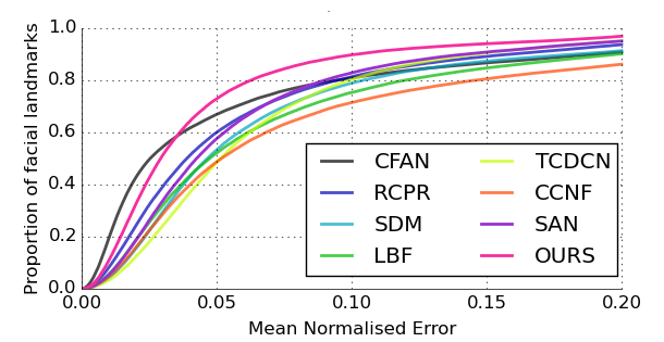 图的含义:横坐标是 归一化的平均误差,纵坐标是 人脸关键点的比例