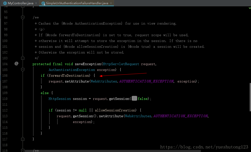 SimpleUrlAuthenticationFailureHandler(简单认证故障处理)会把异常保存到request或session中,forwardToDestination默认为false,也就是保存在session,实际我们测试是保存在request。