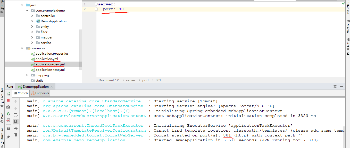 设置生效配置文件,创建多个配置文件,在主配置文件中,使用profiles.active设置生效配置文件