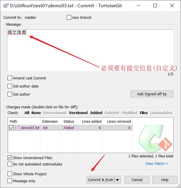 - 步骤2:提交内容,编写提供消息,如果提交文件没有版本,需要勾选。
