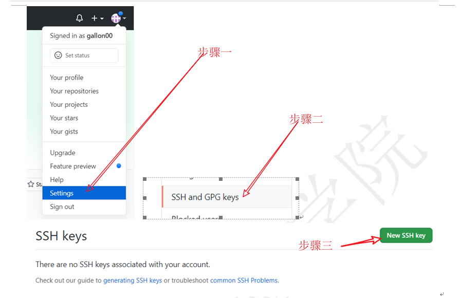 步骤四:登录GitHub设置GitHub的SSH信息,“账号/Settings/SSH and GPG keys”