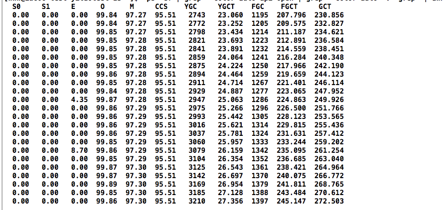 根据用户反馈,某服务不能提供服务,然后我们进行排查,进程id还在,但日志不输出。通过jstat -gcutil 查看内存使用情况;发现出现Full GC了。