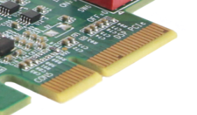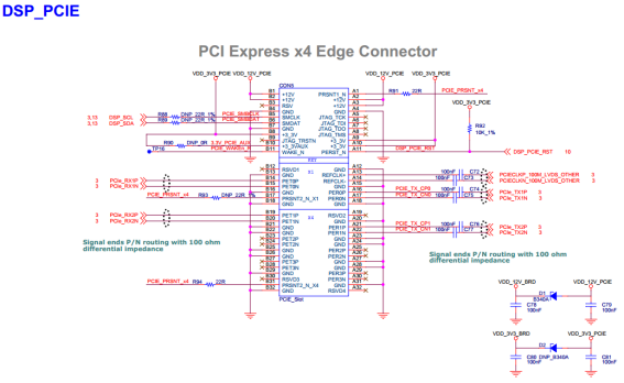 开发板引出了PCIe Gen2 x4接口(CON5),2通道,编码方案为8b/10b,总共64pin,主接口区42pin,单通道理论最高传输速率达5GBaud,即为5GBaud*8/10=4Gbit/s,硬件及引脚定义如下图: