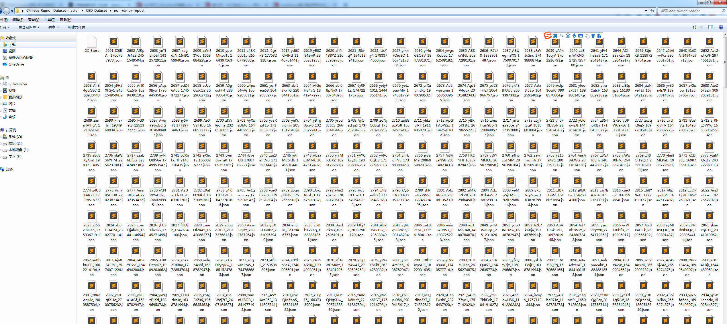 本次实践所使用的数据[验证码:u0is]是从新浪微博不实信息举报平台抓取的中文谣言数据,数据集中共包含1538条谣言和1849条非谣言。如下图所示,每条数据均为json格式,其中text字段代表微博原文的文字内容。这里需要说明的是,本人在自己百度网盘上传了一份数据集,大家可以下载使用,具体链接,前面介绍了,另外如果感觉数据集不够庞大,可以从中文谣言数据中下载更多的数据集,我上传的那份数据集也是来自这里。接下来我们大概看看数据集的构成。其中的文件夹如图所示:
