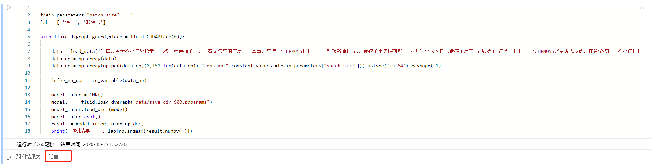 结果还可以,这里说明的是,刚开始我们的模型训练评估不可能这么好,可能存在过拟合或者欠拟合的问题,不过更常见的是过拟合,这就需要我们调整我们的epoch、batchsize、激活函数的选择以及优化器、学习率等各种参数,通过不断的调试、训练最好可以得到不错的结果,但是,如果还要更好的模型效果,其实可以将CNN换为更为合适的RNN、LSTM以及bi-LSTM模型会好很多,我们下篇文章在为大家介绍。最后就是我们的模型的预测。
