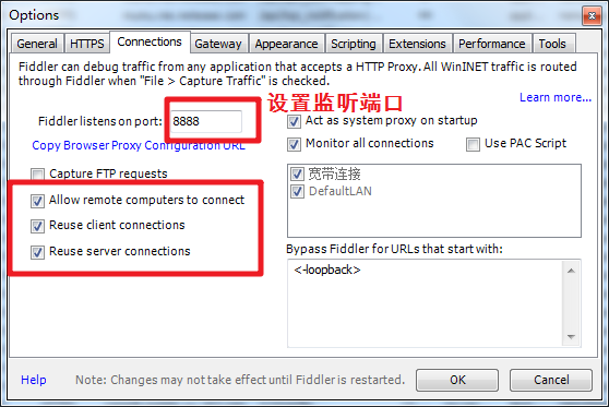 2、设置fiddler监听端口以及远程连接配置