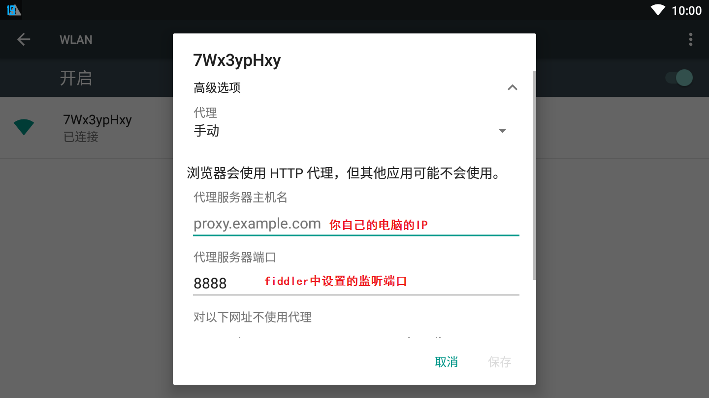 选择高级选项中的,手动设置代理,填写你自己电脑客户端的ip和fiddler设置的监听端口