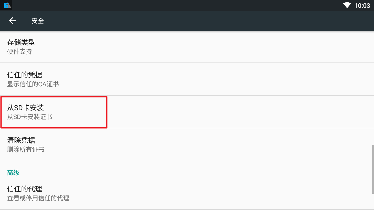 选择从SD卡中安装证书,点击左上角选择内部存储空间中的共享文件夹中找到证书,点击安装即可