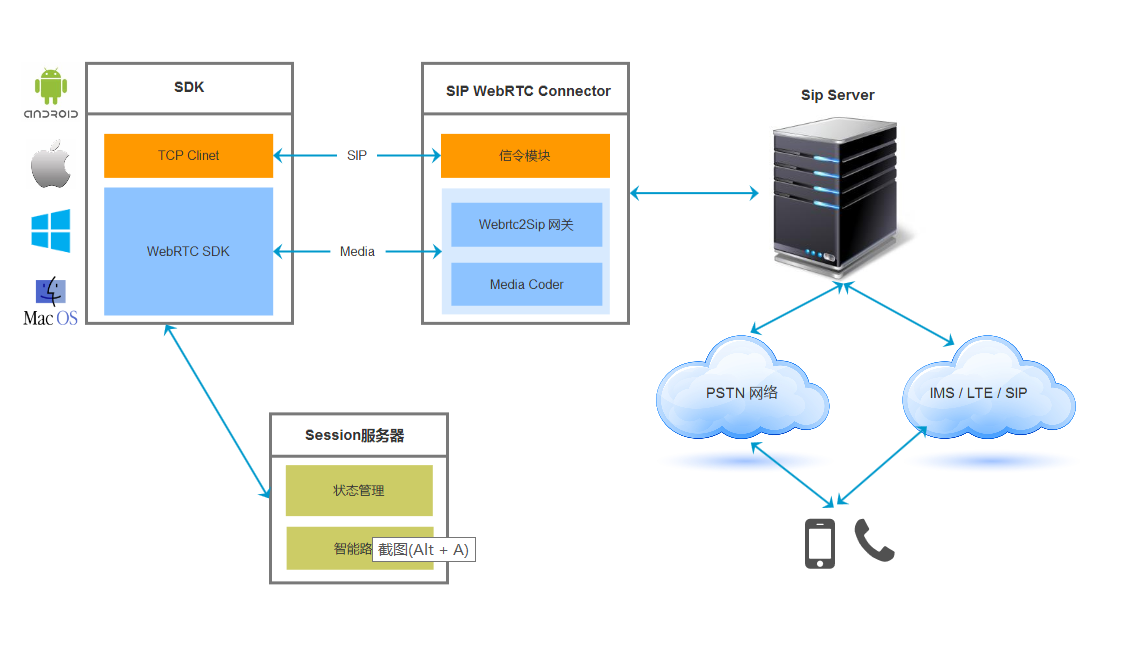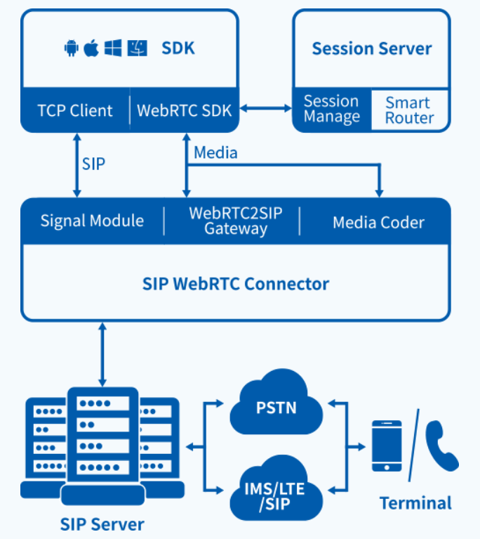 目前在国内需要WebRTC协议与SIP协议互通的场景主要集中在应用程序(App/Web)对接企业呼叫中心系统客服坐席、音视频会议对接PSTN/SIP音视频通话、企业内部App移动工作台(智能办公电话)、CRM系统集成电话呼叫功能、智能硬件(如:智能门禁设备、电梯救援设备、智能陪伴机器人)对接PSTN通话等落点电话场景。