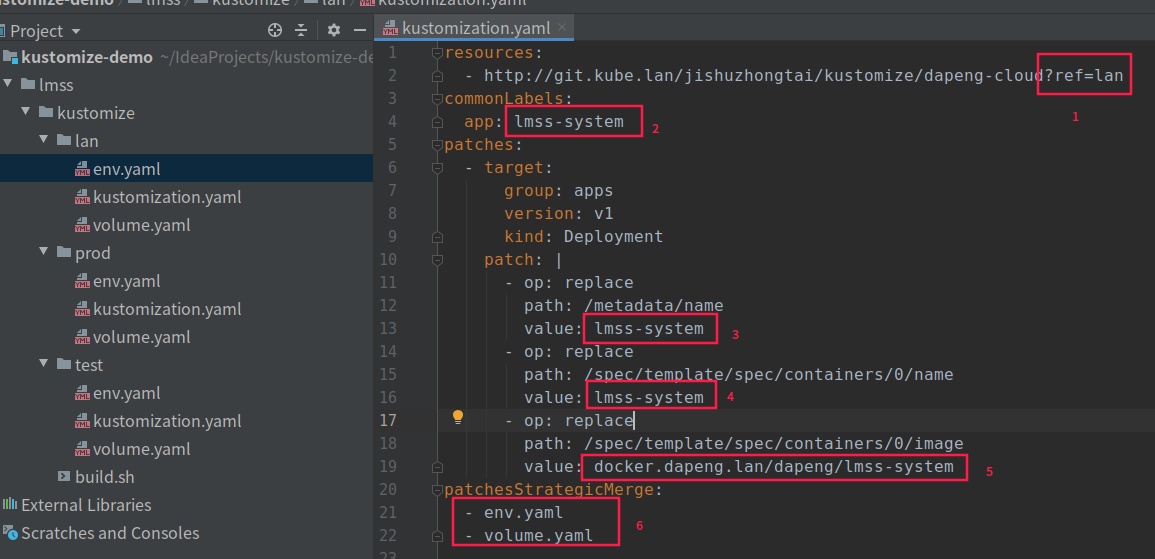 kustomize文件夹,其中包含lan,test,prod三个子文件夹(内网,线上测试,正式环境), - 每个文件夹下必须有一个