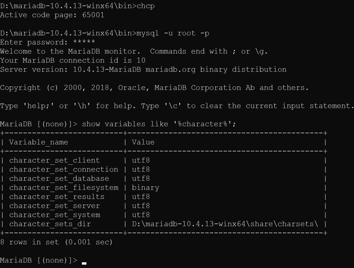 6. 在第3步的图中, 其中的 character_set_client, character_set_connection, character_set_results 这三个变量之所以是gbk是因为我用的是windows的cmd, 说白了就是由客户端决定的, 如果我们把cmd的编码改为utf-8, 这三个变量的值也会变化, 下面就是测试