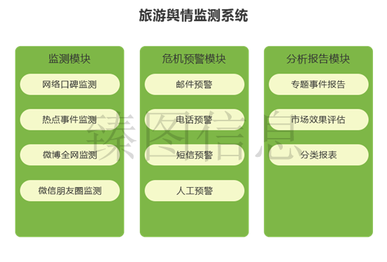 旅游局(旅游管委会)或景区创建旅游网络舆情监测系统软件,对主要新闻媒体、社区论坛、博客、新浪微博等方式舆情信息展开动态性监管,将海量数据依照信息的正负面信息、知名度、信息内容特性及时间等展开归类,获取基本信息,按时自动生成相对汇报,依照预订对策对潜在性的危机事件及时预警和处理。