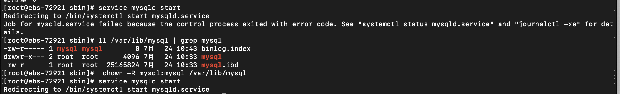 根据提示,分别使用service mysqld status和journalctl -xe查看服务启动失败的原因,发现是目录权限不足造成的,通过查看mysql目录发现目录下有的文件归属还是root,改成mysql即可。