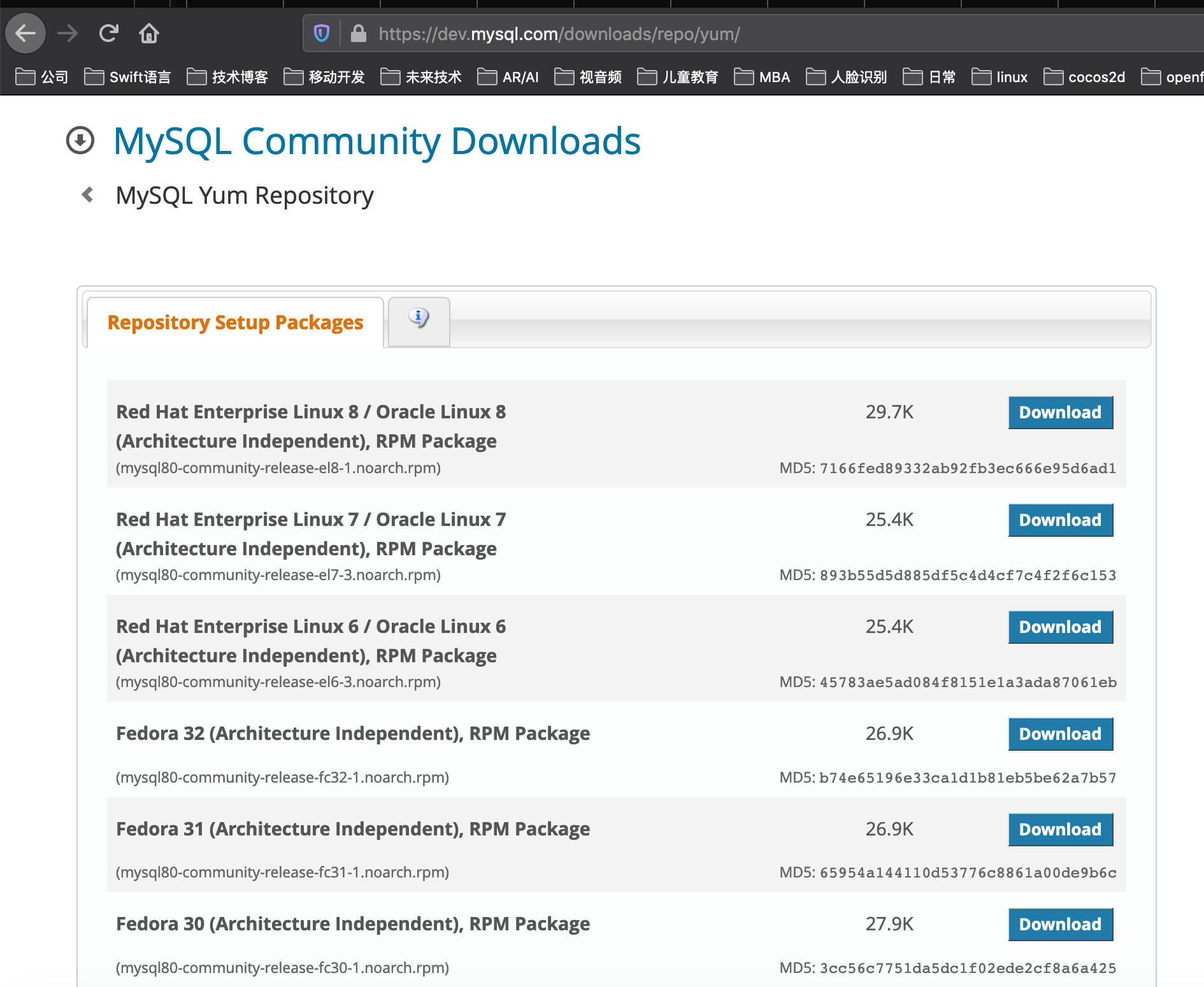 接下来我们在 Centos7 系统下使用 yum 命令安装 MySQL,需要注意的是 CentOS 7 版本中 MySQL数据库已从默认的程序列表中移除,所以在安装前我们需要先去官网下载 Yum 资源包,下载地址:https://dev.mysql.com/downloads/repo/yum/