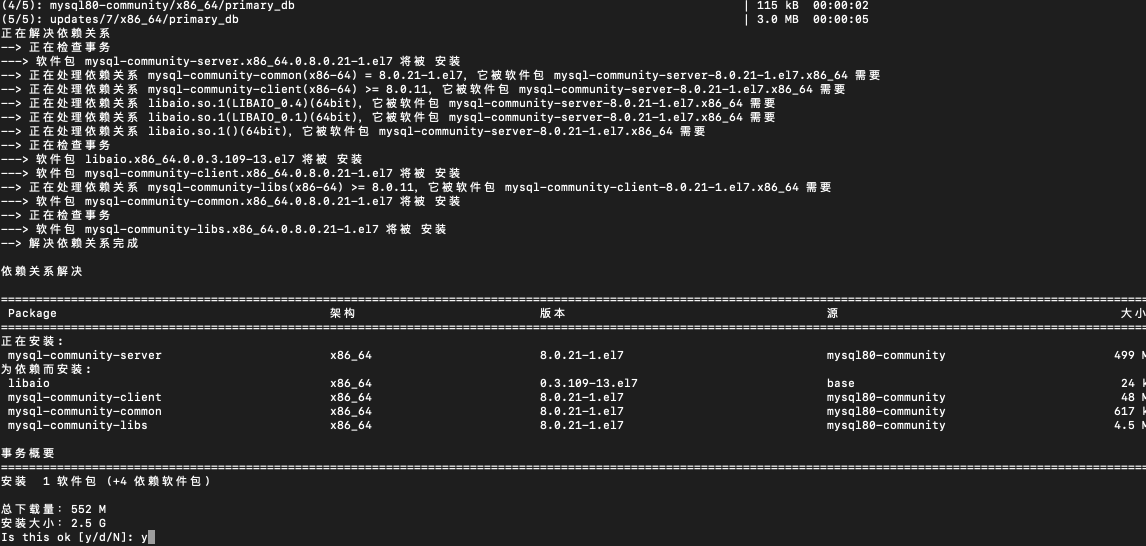 安装过程中会需要提示下载依赖,按 y 确认下载即可: