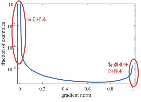 如下图所示(图片来自知乎[5]),梯度模长g接近于0的样本数量最多,随着梯度模长的增长,样本数量迅速减少,但是在梯度模长接近于1时,样本数量也挺多。