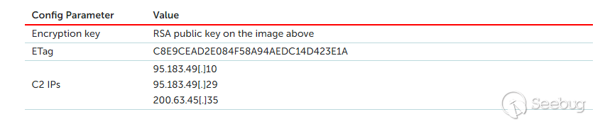 操作者将RSA公钥和唯一的HTTP ETag保留在加密的配置数据中。出于Web内容缓存原因而创建的此标记也可以用于过滤对C2的请求,如:来自网络扫描程序而非目标的请求。除了上述用于与C2通信的RSA公钥外,该恶意软件还使用自行生成的AES-128密钥。