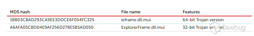 下面的分析基于上表中的32位样本,合法的ExplorerFrame.dll.mui是Windows资源管理器使用的ExplorerFrame.dll文件的语言资源。