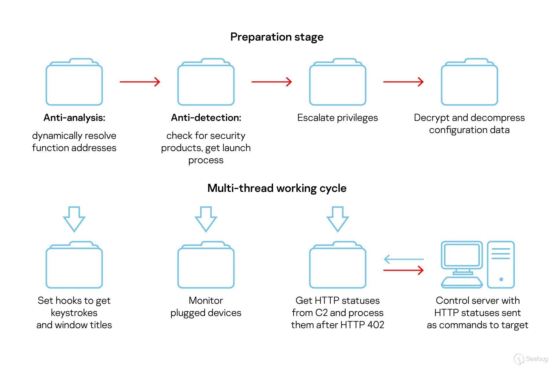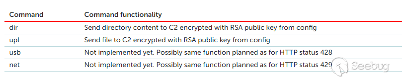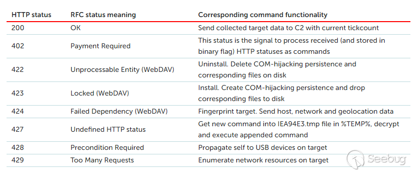 我们观察到了一个有趣的C2通信协议,该协议使用了罕见的HTTP/HTTPS状态代码(即IETF RFC 7231,6585,4918),而Client Error类中的几个HTTP状态代码(422-429)会使木马知道操作员想要做什么,在控制服务器发送“Payment Required”(402)状态之后,会执行先前所接收到的命令。