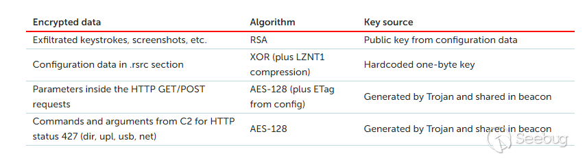 就像之前来自同操作者的恶意软件一样,所有必要的功能地址都可以进行动态解析,这样会使分析变得复杂化。为了通过HTTP/HTTPS将目标数据泄露到C2,然后恶意软件使用RSA进行加密,通过LZNT1压缩单字节的XOR进行加密实现本地数据隐藏。